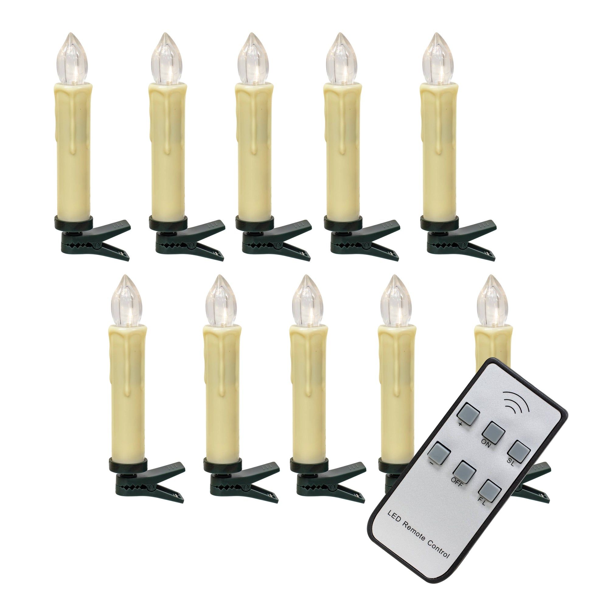 Remote Clip Tapers in Ivory sell as a set of ten ivory taper candles with a dark green clip base for attaching to trees, wreaths, windowsills, and more. Tapers have a warm white light and include a built-in timer that keeps them lit for 6 hours, then off for 18 hours. Clips also come with a handy remote for easy on/off functions from up to five feet away. Remote runs on 1 CR2025 battery (included). Each taper clip is 4.5" high and requires 1 AAA battery (not included).