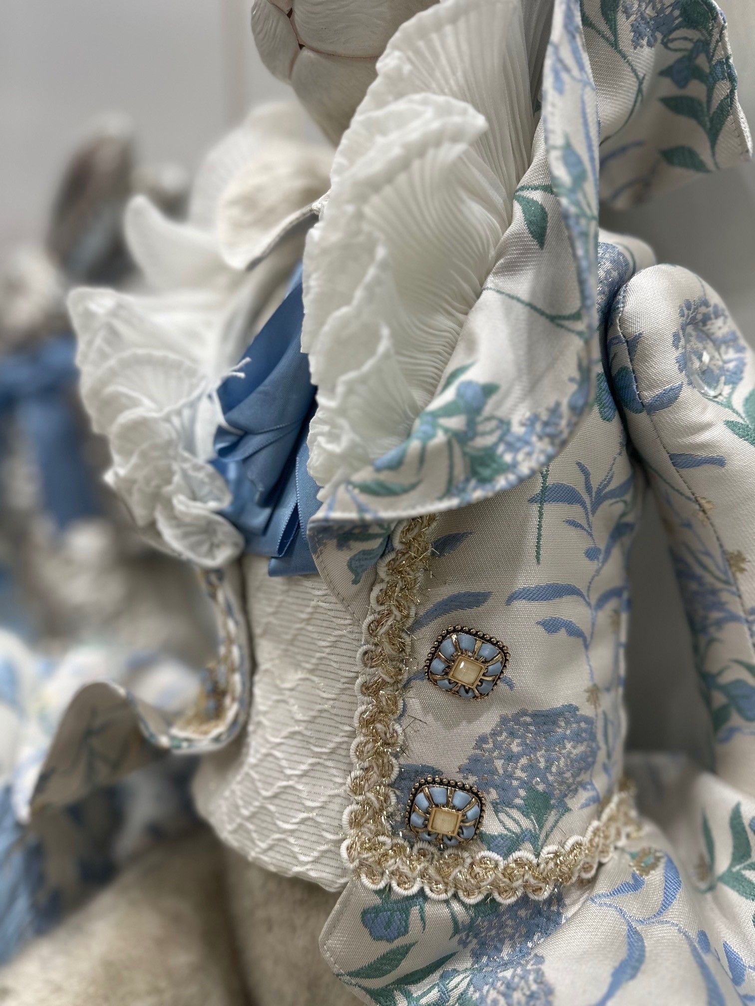 Meet Jasper, the ever-dapper gentleman of the garden. Sitting tall, he’s dressed in a soft baby floral blue coat that adds a dash of storybook charm to his gentle presence. Crafted from resin and polyester, Jasper blends sculptural elegance with a hint of plush warmth—perfect for seasonal displays or nursery corners.