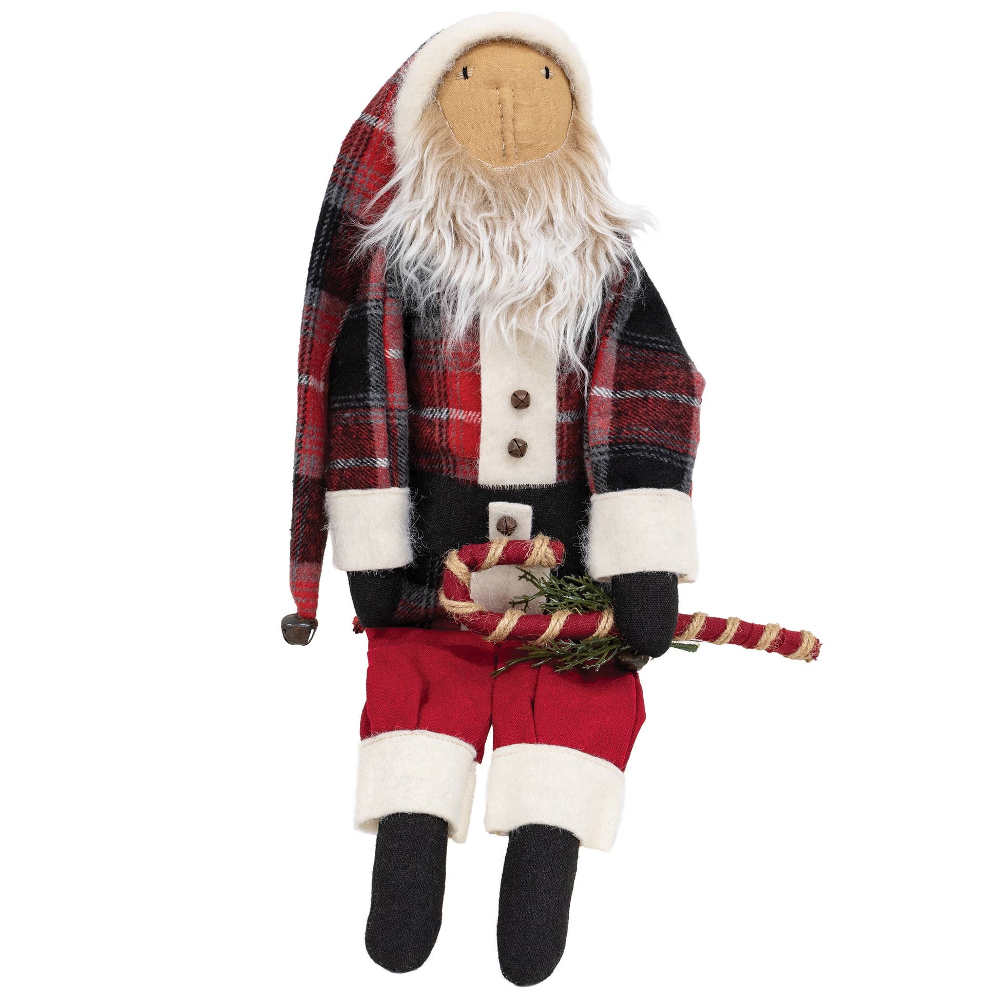 The Plaid Coat Santa Doll is a festive primitive decor piece made with seasonal style. The Santa doll features a plush face with a simple embroidered nose and eyes and a long, fluffy beard. A stuffed body, stuffed arms, and dangling legs form the doll's body. The doll is wearing a red and black plaid Santa suit complete with jingle bell buttons and a long hat. A red candy cane wrapped in jute twine and accented by a sprig of faux greenery and a rusty jingle bell rests in the figure's hand. Measures 23" high by 20" wide (with outstretched arms) by 3" deep.