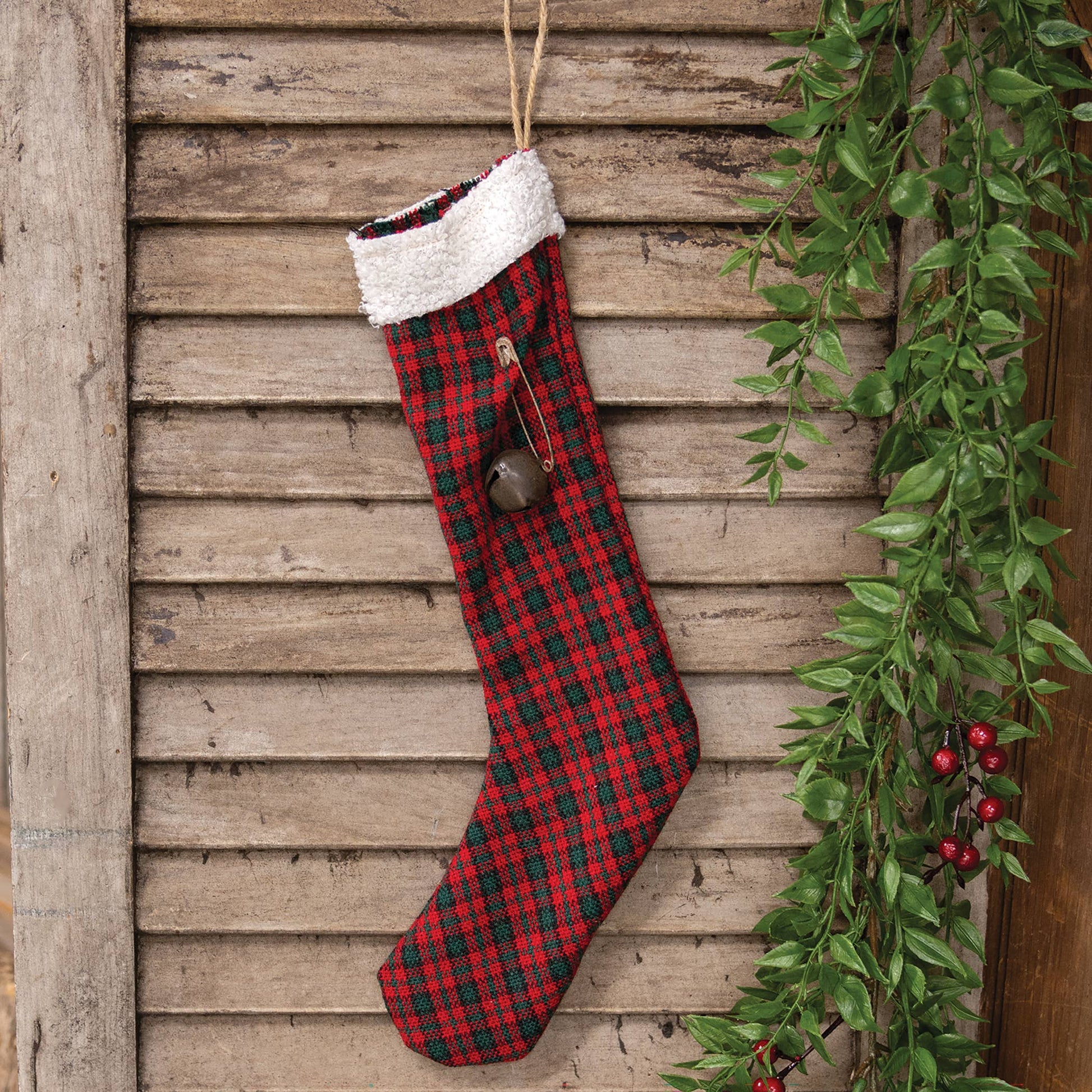The Red & Green Plaid Stocking is a cozy Christmas decor piece suited to rustic, traditional, or farmhouse style. Made from fabric with a green and red plaid print, the stocking features a long shape complete with a fuzzy white cuff. A jingle bell is attached to the stocking with a rusted safety pin for an antique-inspired touch. A jute twine hanging loop allows for easy display from a wall, tree, or mantel. Measures 14” high by 7” wide.